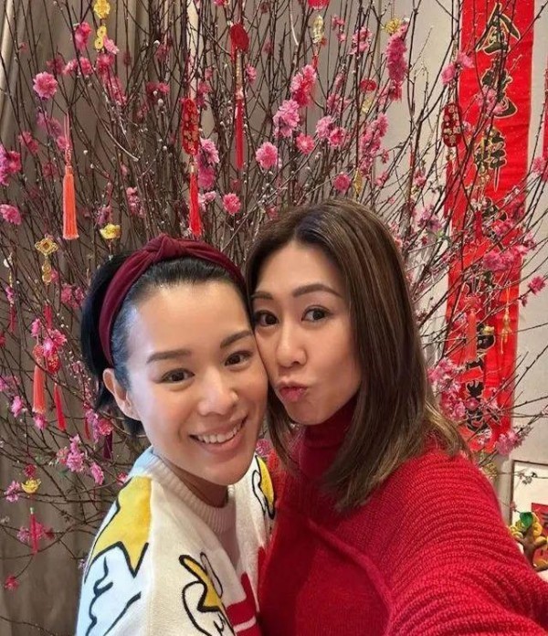 在拜年当天,胡定欣穿着红色贺年服装,与胡杏儿在樱花前合照,十分喜悦。