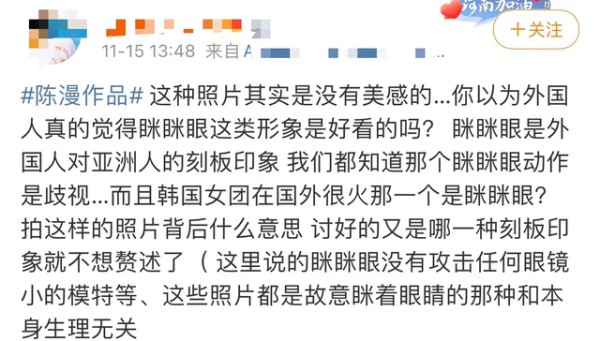 11月15日,明星摄影师陈漫因为最新的一张照片被批丑化亚裔形象,在网上引起了不小的争议。