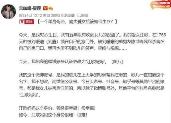 但是面对这些质疑并不没有打垮她,因为她知道女儿走了,生活的重担都落在她身上,她必须坚强,在微博里,江歌妈妈幻想女儿还在世的情景.....