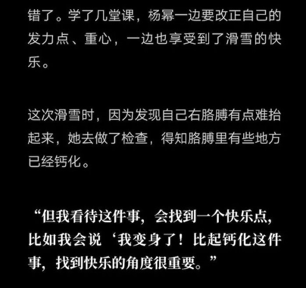 近日,演员杨幂在接受采访时透露,此前滑雪时发现右胳膊难抬起来,去检查发现有些地方已经钙化。