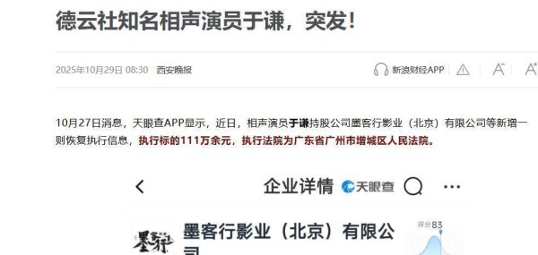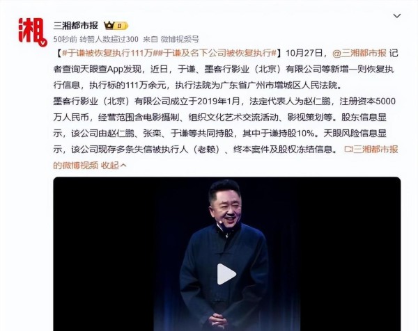 于谦持有10%股份的墨客行影业(北京)有限公司,最近又新增了恢复执行的信息,涉及的执行标的大概111万多元。