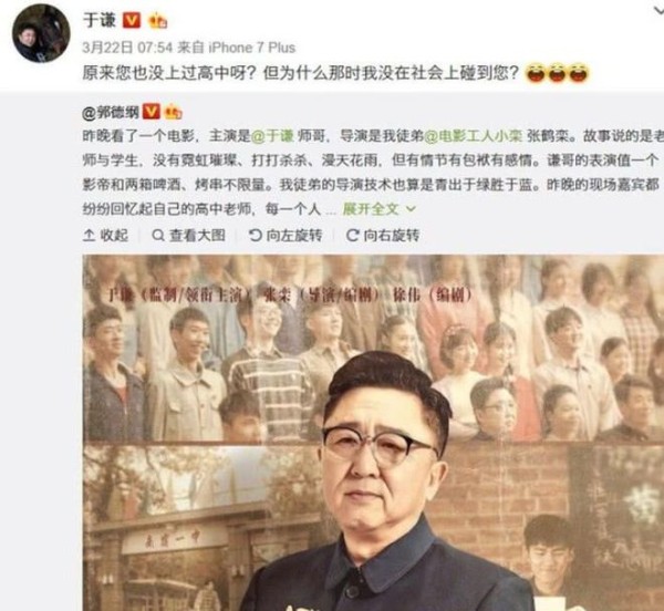 于谦可能就是下一个实力派,虽然他以前一直是优秀捧哏,但是扮起高中老师来也丝毫没有违和感,身为老大的郭德纲自然不能说直接写了一篇影评,于谦就发文调侃郭德纲,居然也没有上过高中呀,为什么那时我没在社会上碰到你?钢丝们就在下方吐槽称有人在这边秀恩爱了!