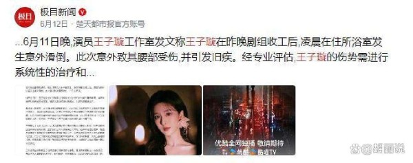 但拍摄不到半个月,事就出了。6月11日,王子璇拍完一天的工作后回到酒店,准备洗个澡放松一下。这一洗,却出了大事——她在浴室不小心滑倒,腰部重重摔在地上。当场就感觉火辣辣的疼,还引发了旧疾复发。消息一出来,粉丝们都紧张了,人们担心她的身体状况会不会有变糟。
