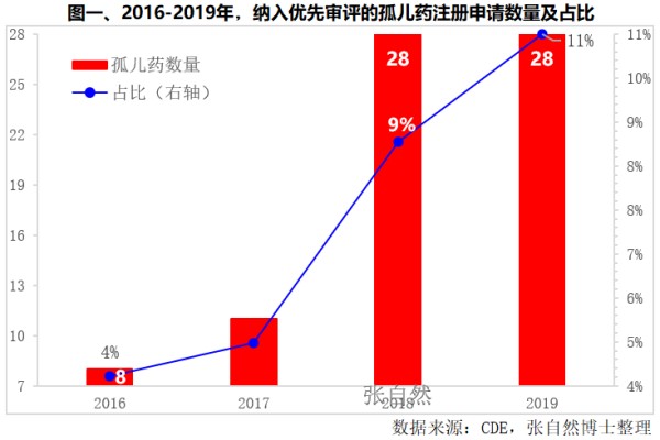 (一)国内申报 为提高药物可及性,自2015年国务院发布44号文以来,我国加快了药物审评审批的速度,尤其加快了对孤儿药的审评审批,以《第一批罕见病目录》确定的121种罕见病为据,自2019年以来,我国已新增批准上市14种罕见病药物,但有16种罕见病仍处于“境外有药、境内无药”的窘境。 为优先提高部分急需药品的审评速度,国家药监局专门开辟了优先审评通道,近年来,越来越多的孤儿药被纳入优先审评,纳入优先审评的孤儿药申请数量已由2016年的8个,占全部优先注册申请数的4%,提高到2018年和2019年的各28个,分别占当年全部优先审评注册申请数量的9%和11%。