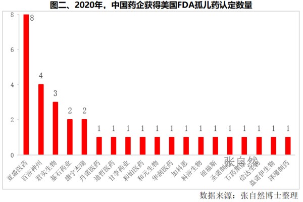 (二)FDA申报 近年来,随着我国整体医药研发实力的快速提高,我国药企对孤儿药的研发也取得了可喜进步,除在国内申报外,也加强了在海外的注册,截至2020年12月20日,共有19家中国药企的26款产品累计获得了35项FDA孤儿药资格(按适应症计),占FDA全年授出孤儿药资格数量的8%。其中亚盛医药凭借4款药物囊获8项孤儿药资格认定成为最大赢家;百济神州、君实生物则分别以4项和3项认定位居其后。