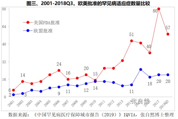所谓罕见病,即发病率极低的疾病,WHO将罕见病定义为患病人数占总人口0.65‰-1‰的疾病,美国则定义为每年患病人数<20万人(或发病人口比例<1/1500)的疾病,中国于2018年6月8日发布《第一批罕见病目录》,确定121种罕见病。 用于预防、治疗、诊断罕见病的药品又称为“孤儿药”,由于罕见病患病人群少、市场需求小、研发成本高,所以企业研发孤儿药的积极性不高,但由于各国都出台了一系列鼓励政策,所以,近年来,孤儿药的研发进展很快,我国的孤儿药研发进展则更快,下面就分别对我国及欧美在孤儿药研发领域的进展作一比较分析。
