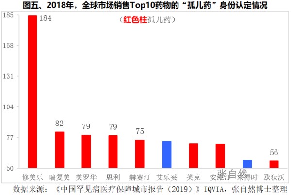 据《中国罕见病医疗保障城市报告》统计,2018年全球销售额Top10药物中,除艾乐妥和来得时以外的8个均已在美国获得“孤儿药”身份认定,其中有4个药物是以“孤儿药”身份上市并逐渐扩展多个罕见病或非罕见病适应症,而全球销售排名第二的瑞复美(来那度胺)在美国获批的骨髓增生异常综合征、多发性骨髓瘤和套细胞淋巴瘤等所有适应症都是罕见病且获得了“孤儿药”身份认定。 稳居全球药王宝座9年之久的修美乐于2008年以“孤儿药”身份获批幼年型类风湿性关节炎适应症。 有罗氏三驾马车美称的美罗华、赫赛汀和安维汀,分别以非霍奇金B细胞淋巴瘤、HER2过表达的晚期胃腺癌和恶性胶质瘤等获批罕见病适应症。