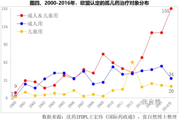 据沈阳药科大学王伟统计,2000-2016年,欧盟认定的1805个孤儿药适应症中,以成人&儿童用适应症为最多,共953个,占了总数的占53%,其次为儿童用药为236个(占13%),成人用药616个(占34%)。 2000年,欧盟批准的成人&儿童用、成人用和儿童用孤儿药适应症的数量分别为9个、3个和2个,后来,成人&儿童用获批的适应症数量越来越领先, 2016年,欧盟批准的成人&儿童用适应症数量高达155个,是后二者之和的近3倍。