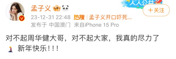 女星跨年晚会上唱歌跑调后致歉:对不起周华健大哥,我真的尽力了孟子义发文回应唱歌跑调:对不起周华健大哥