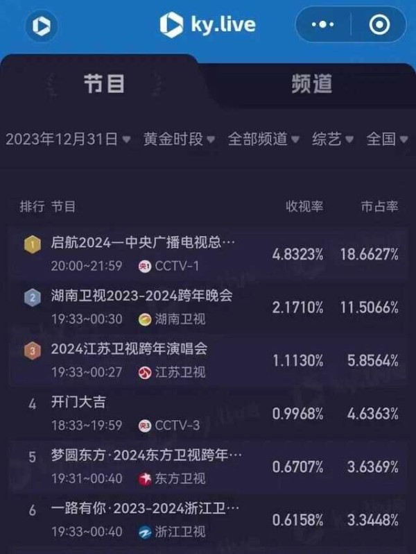 据媒体报道,2024年1月1日,收视率统计即时性最强的酷云数据出结果了。