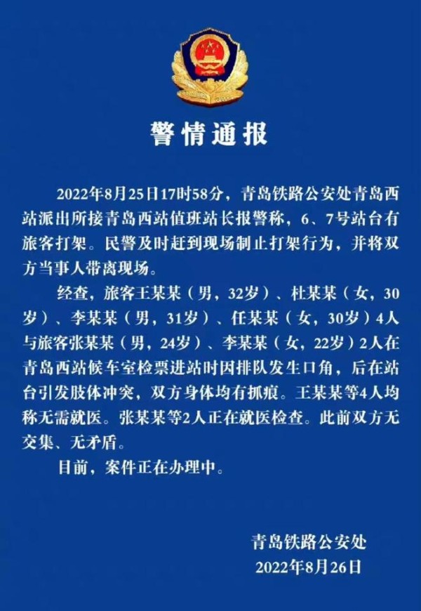 26日,青岛警方通报称,因排队发生口角,后在站台引发肢体冲突,双方身体均有抓痕,此前双方无交集、无矛盾。