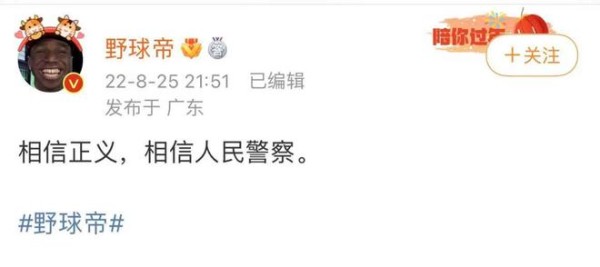 25日晚9点51分,“野球帝”在微博账号上发布动态“相信正义,相信人民警察”。