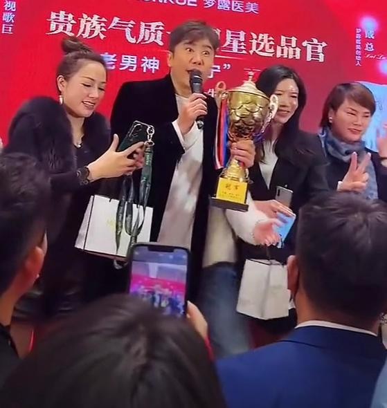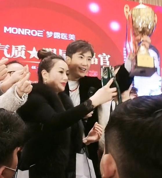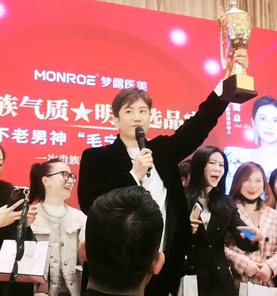 在浙江温州某医美品牌举办活动的现场,整个活动场地也被布置得很气派,各种红色的横幅也被拉满,也象征着生意红红火火,而彼时的大明星毛宁正站在舞台的正中央,他左手还捧着一个金光灿灿的大奖杯,整个人看起来也是精神气十足。