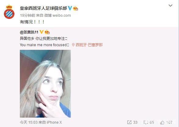 西班牙人官方第一时间围观,“有情况!”而球迷纷纷点钟,“女友真漂亮,什么时候带回家啊,领回来吃咱的油泼面。不说别的,好好孕育中国足球的下一代!”