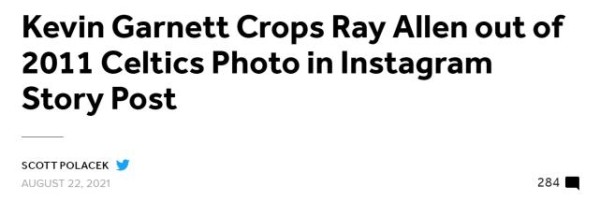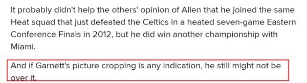 阿伦在热火效力两个赛季,又夺得一座总冠军,随后,他告别了NBA赛场。这么多年过去了,阿伦和加内特等人的紧张关系并没有得到舒缓。美媒Bleacher Report报道时,感慨道:“加内特在合影里裁掉阿伦的举动,说明了他的心里仍未释怀。”