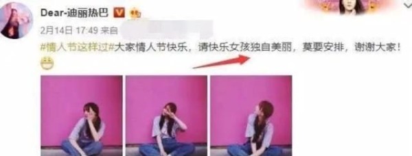 张艺兴和迪丽热巴在春节联欢晚会上合唱了一曲,两个人约好在对唱时要有互动,在需要情感诠释的地方凝视了对方一眼。结果却因为这个想要达到更好的表演效果的举动,被大家给误会了。图片来自网络很多人在看到张艺兴和迪丽热巴对视后,就觉得两个人CP的既视感,就乱点鸳鸯谱硬拉CP,甚至到后来还出现什么公开恋情的假新闻,瞬间两个人绯闻闹得沸沸扬扬的,甚至搜索他们的名字都会出现对方的相关。图片来自网络面对绯闻,张艺兴在情人节的前一天借着情人节这个机会,公开回应了和迪丽热巴的恋情,在微博中称自己不过情人节,借此来宣告自己的单身的状态,让别人不要乱点鸳鸯谱。