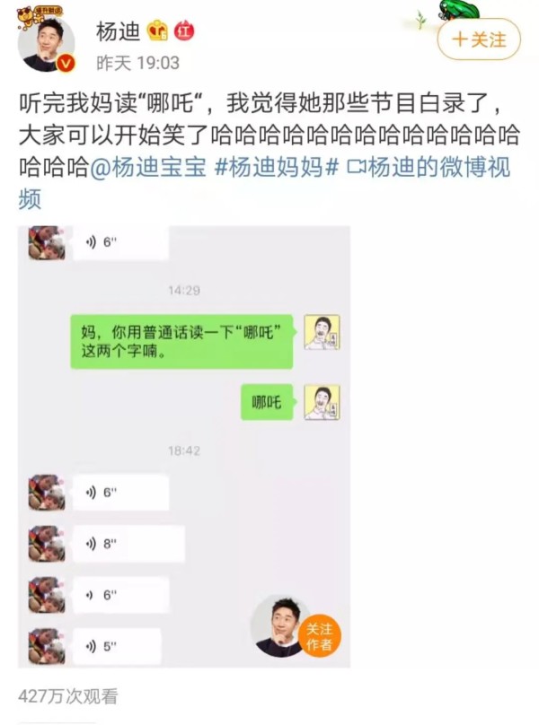 而就在昨天,杨迪在微博上传了一段他妈妈读“哪吒”的视频,并配文:“我觉得她那些节目白录了,大家可以开始笑了,哈哈哈哈哈。”