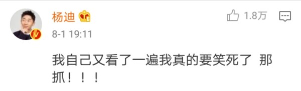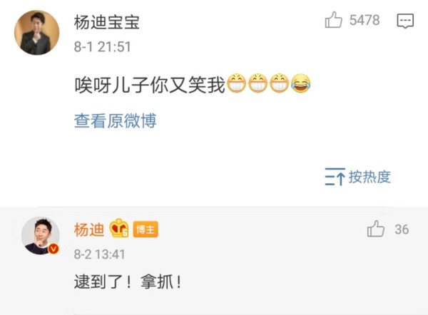 在杨迪发完微博后,迪妈妈很快就“现身”了,在杨迪微博下面留言“哎呀,儿子你又笑我。”杨迪还调皮的回复妈妈“逮到了,拿抓!”