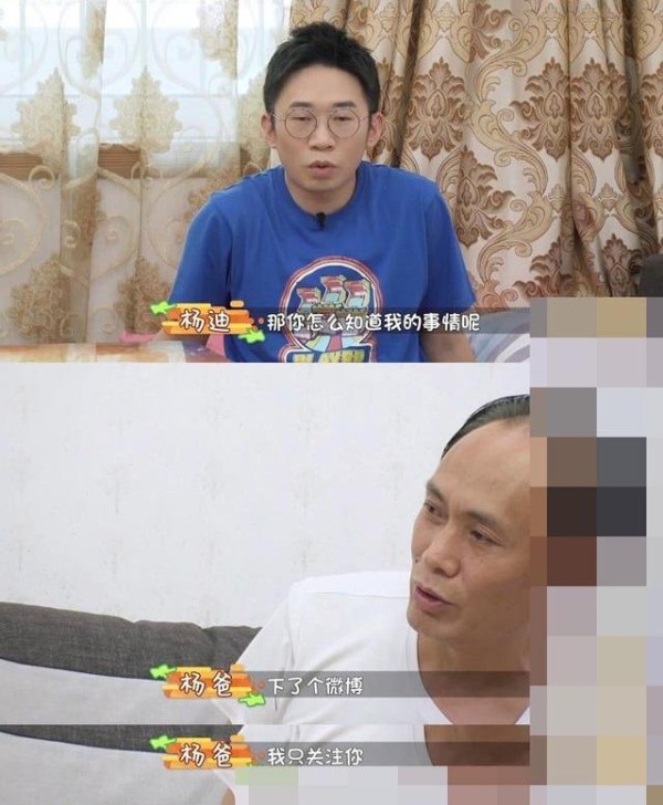 杨迪其实也是承认这种情况的,但这次既然是要和父亲聊天,他也在主动找话题,随后就问出了自己好奇的问题,自己和父亲无话可说,也不曾向他提及自己的生活情况以及工作,为什么父亲却对自己的这些事情非常了解呢?而父亲的答案是:我注册了微博,只关注了你。