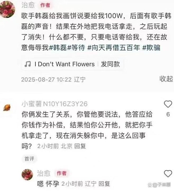 "都说 ' 台上唱情台下重义 ',可 57 岁的歌坛大哥韩磊,却被曝在妻子背后演了出 ' 怀孕补偿戏 '!"8 月 27 日辽宁网友徐晓文的一则爆料,让这位以 "德艺双馨" 自居的歌手瞬间跌落神坛 : 承诺 100 万补偿怀孕情人后不仅反悔,竟拿走对方手机玩起消失,20 年的模范婚姻人设一夜崩塌。