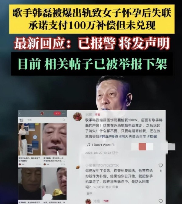 这事儿得追溯到8月27日那天。一位叫“治愈”的辽宁姑娘在社交平台上发了个贴,说韩磊这个著名歌手把她搞怀了,可就是不认账,不负责。