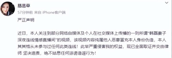 然而,事情并没有朝着大家预想的方向发展。就在昨天晚上,韩磊的妻子王燕坐不住了,迅速在微博发布严正声明,辟谣所谓的 “韩磊妻子深夜连线情感直播间” 的视频。