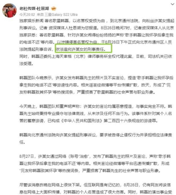 这边韩磊妻子刚辟谣,28 号晚上 8 点多,资深媒体人杜恩湖也发文了,称韩磊将起诉爆料女子,追究其刑事责任。