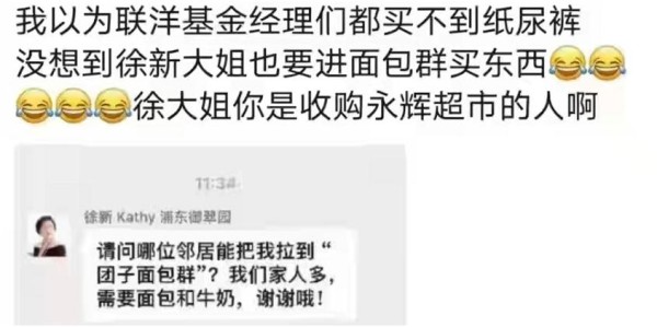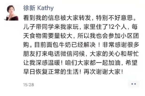 当天下午晚些时候,徐新在朋友圈回应表示:看到我的信息被大家转发,特别不好意思。儿子带同学来我家玩,家里住了12个人,每天食物需要量较大,所以我也会参加小区团购。目前面包牛奶已经解决!非常感谢很多朋友打来电话微信问候,大家的关心和帮忙让我深感温暖!咱们大家都一起加油,希望早日恢复正常的生活!再次谢谢大家!