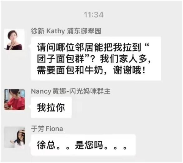 截图中,徐新为团购牛奶面包询问“请问哪位邻居能把我拉到‘团子面包群’?我们家人多,需要面包和牛奶,谢谢哦!”