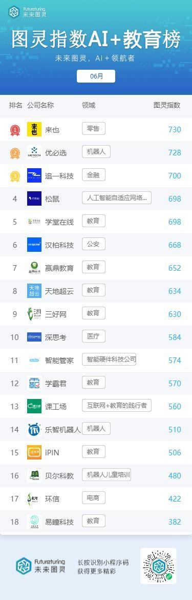 在教育榜单中,来也位列第1位,本月第2、3位分别由优必选与追一科技获得。