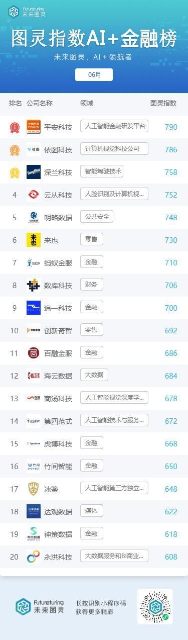 在金融榜单中,平安科技领跑本月榜首,依图科技、深兰科技紧随其后。
