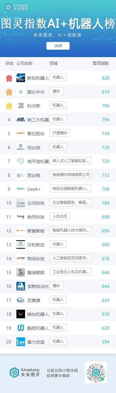 未来图灵AI明星企业6月榜单出炉 腾讯阿里百度分列前三