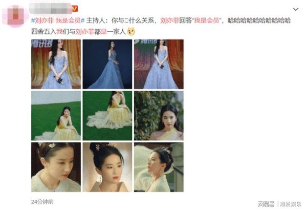 2021年6月8日,刘亦菲在热搜发文:我是会员。拾光盛典上的刘亦菲姐姐是走喜剧人路线了嘛!抛梗说来就来,刘亦菲采访真的好有梗,一张口就是人间段子手。大清早给我笑醒了哈哈哈哈又发现了一下我和刘亦菲的共同点。主持人问姐姐和腾讯是什么关系,姐姐说“我是会员”,这完全没毛病啊哈哈哈,看来姐姐也在认真追剧。