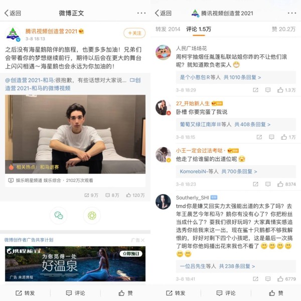B 站 UP 主@电视这个圈儿 发布的视频《号外!和马退赛另有隐情?导演揭秘内幕!》已经获得 30 万次播放,该 UP 主引用腾讯《创造营 2021》的竞争对手节目爱奇艺《青春有你 3》的导演的话说,“在选秀节目中,选手退赛的真实原因都不是官方公开的原因”。