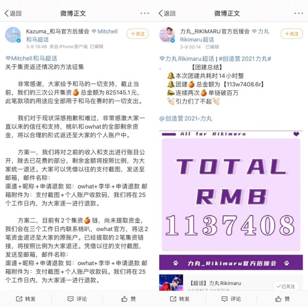 和马官方后援会在 3 月 8 日宣布,已经累计集资 82.5 万元人民币,并且组织向粉丝退款。和马的突然退赛引发了同公司另外四名选手粉丝的紧张。当晚,四家粉丝后援会都组织粉丝开启了紧急集资,米卡后援会正在冲击 110 万元,力丸后援会在短短 14 小时内筹集了 113 万元。