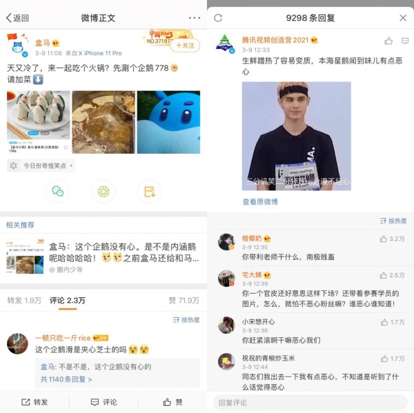3 月 9 日上午,与“和马”同音的阿里巴巴新零售平台“盒马”借谐音梗之机,在官方微博平台发布博文“天又冷了,来一起吃个火锅?先涮个企鹅 778”,配图是将企鹅形状的墨鱼滑丸扔入滚沸的汤锅中。