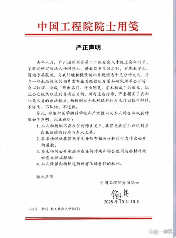 学术圈在某些人眼里变成了名利场,就像把实验室当成了股票交易所。师徒之名本该是学术传承的纽带,如今却被一些人当成了"社交货币",用来交换资源、获取机会。钟世镇院士用最传统的纸笔书写声明,守护的却是学术界最珍贵的风骨——那种容不得半点虚假的学术尊严,从来不是可以用来消费的商品。
