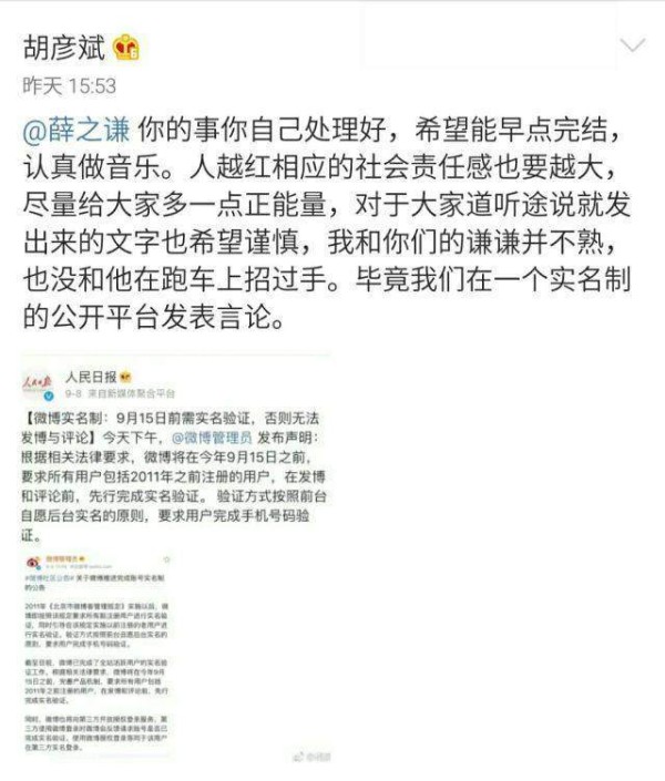 薛之谦出事胡彥斌发文撇清关系“我和你们的谦谦并不熟”!