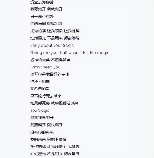 而且,她的这首新歌也是让网友们发现了很大的信息量,就比如说在这首歌中有歌词是这样的“只要一点小意外,你的马脚就露出来”、“离开你是我最好的安排”等等信息量巨大,而且带有比较悲伤的情绪,每一句的含义都颇深,好像有一种在暗示自己的婚姻问题一般。