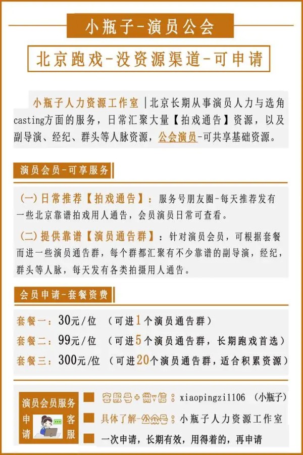小瓶子演员公会 | 如您在北京跑戏当演员,实在没有好的渠道资源,可加小瓶子演员公会,日常有专业推荐通告,以及可进靠谱的演员通告群。