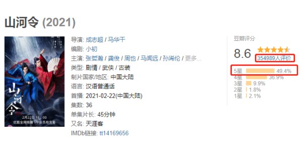 截至目前,该剧上线38天,在豆瓣上有近35万人评价,豆瓣评分8.6分,近一半的人为这部剧打出了5星。猫眼专业版显示,3月31日《山河令》的热度依旧在猫眼热度榜上排名第一,历史最高热度更是一度达9790.11。