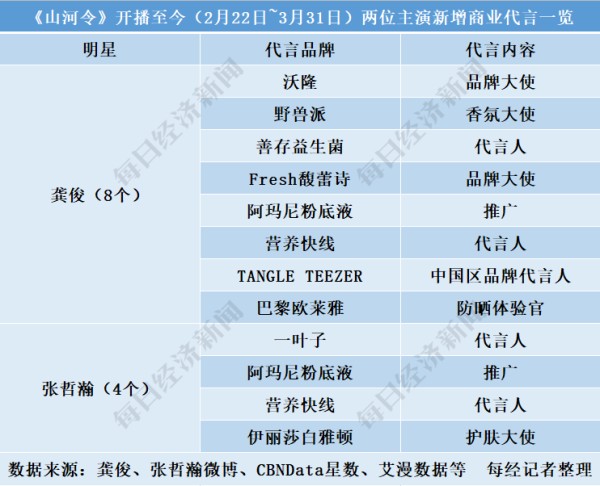 据每经记者不完全统计,2月22日~3月18日,两人共累计官宣12个代言,包括沃隆坚果、一叶子、巴黎欧莱雅等多个品牌,龚俊更是两天连宣3个品牌合作。此外,两人还陆续接到了《王牌对王牌》《快乐大本营》等综艺邀约。