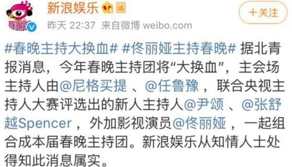 还有刚刚得到的消息,丫丫佟丽娅这回要控场春晚,当春晚的主持人,咱们的总导演杨东升老师这是要大胆试水明星主持吗?不怕搞砸吗?此前那些春晚主持常规部队到哪去了?据说,董卿、李思思、朱迅、康辉等咱们一个都看不见,而许多新鲜的面孔将让大家耳目一新。