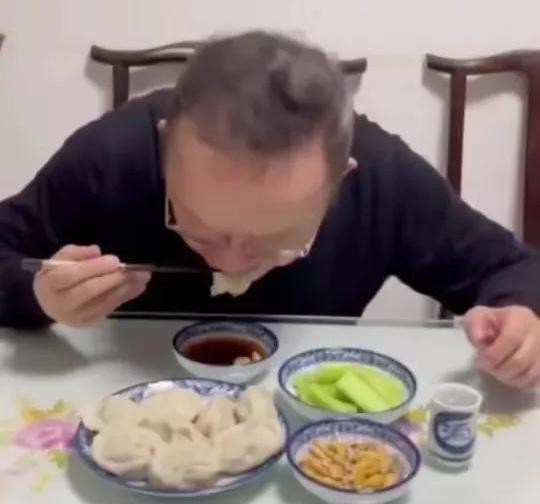 他拿起筷子,稳稳地夹起一个饺子,慢慢蘸了蘸酱料,放入口中,吃得津津有味。