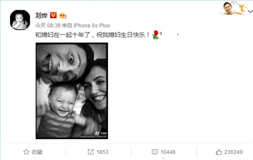 据悉,今天是安娜的生日,刘烨在微博晒出一张旧照称“和媳妇在一起十年了,祝我媳妇生日快乐!”这张黑白旧照中,刘烨吐舌头搞怪,安娜笑得一脸幸福,而小小的诺一更是笑得眼睛眯成缝,一家人分外幸福。网友也纷纷在刘烨微博底下晒出安娜的美照祝福她生日快乐。