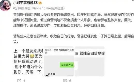 郑爽的工作室显然不太喜欢这种炒作的方式,发文警告胡彦斌不要过度营销。