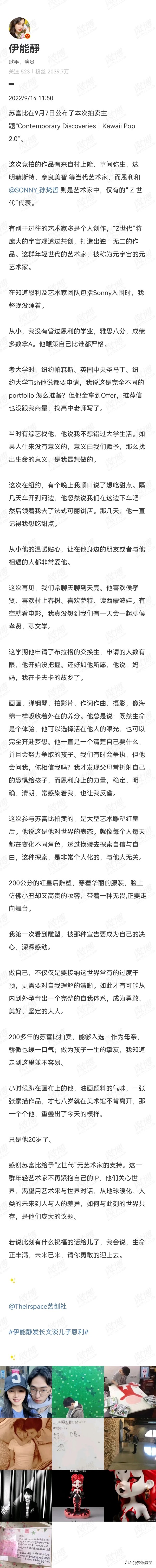 伊能静在文中提到,在得知儿子恩利的作品入围苏富比艺术品竞拍后,自己激动得整夜没睡。同期入围的都是村上隆、草间弥生、达明赫斯特这样的当代艺术家,难怪伊能静激动,毕竟恩利只有20岁。