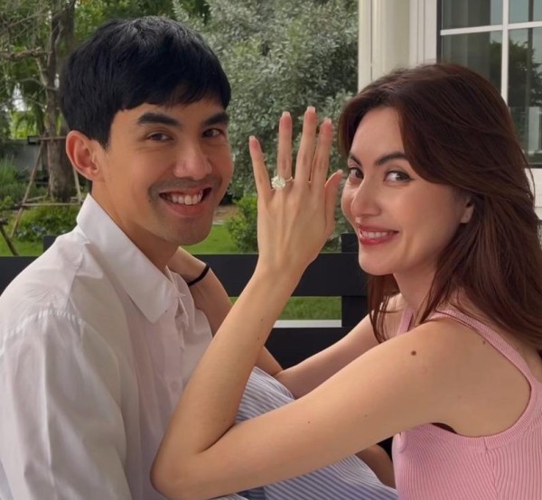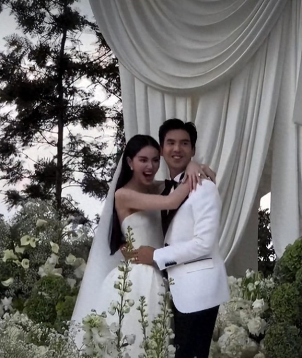 Mai穿着白婚纱站在那儿,手上戴着一个15克拉的大钻戒,笑得那叫一个灿烂。这钻戒可不得了,是Mai自己相中的,然后让老公掏钱买单。据说老公Ter付钱的时候,整个人都在发抖——这也难怪,15克拉的钻戒怎么着也得七位数起步吧。婚礼现场两人还深情拥吻,看着倒是挺甜蜜的。