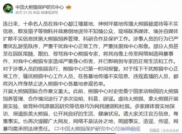 大熊猫基地不得不发声明,将捏造虚假信息和干扰大熊猫基地正常秩序的人列入基地黑名单,永久不能参观大熊猫基地,同时也开始对大熊猫基地内做直播的人进行管理。