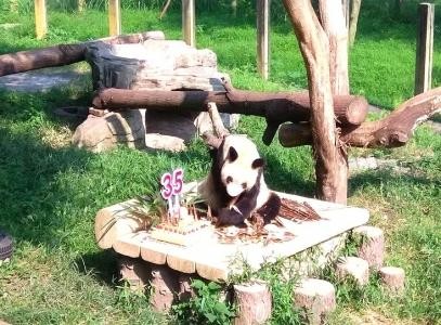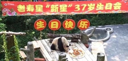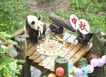 2018年9月4日,重庆动物园为36岁的大熊猫“新星”过中秋节。